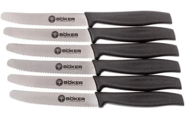 This Böker knife set is comprised of six serrated knives. Perfect when cutting hard buns or croissants. The blade is made from stainless steel and enhanced with a serrated edge. The handle is made from plastic.