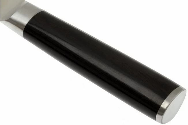 The kitchen knives of the Kai Shun Pro Sho-series have a blade made of VG10-steel which is hardened until an extremely high value of 61 HRC. Combined with the special way of sharpening in which one side is sharpened and the other side is made hollow, these knives are a pleasure to work with. They are truly razor sharp. Ergonomically speaking they have the well-known level of Kai Shun. The asymmetrical handles of laminated black pakka wood fit the hand perfectly.